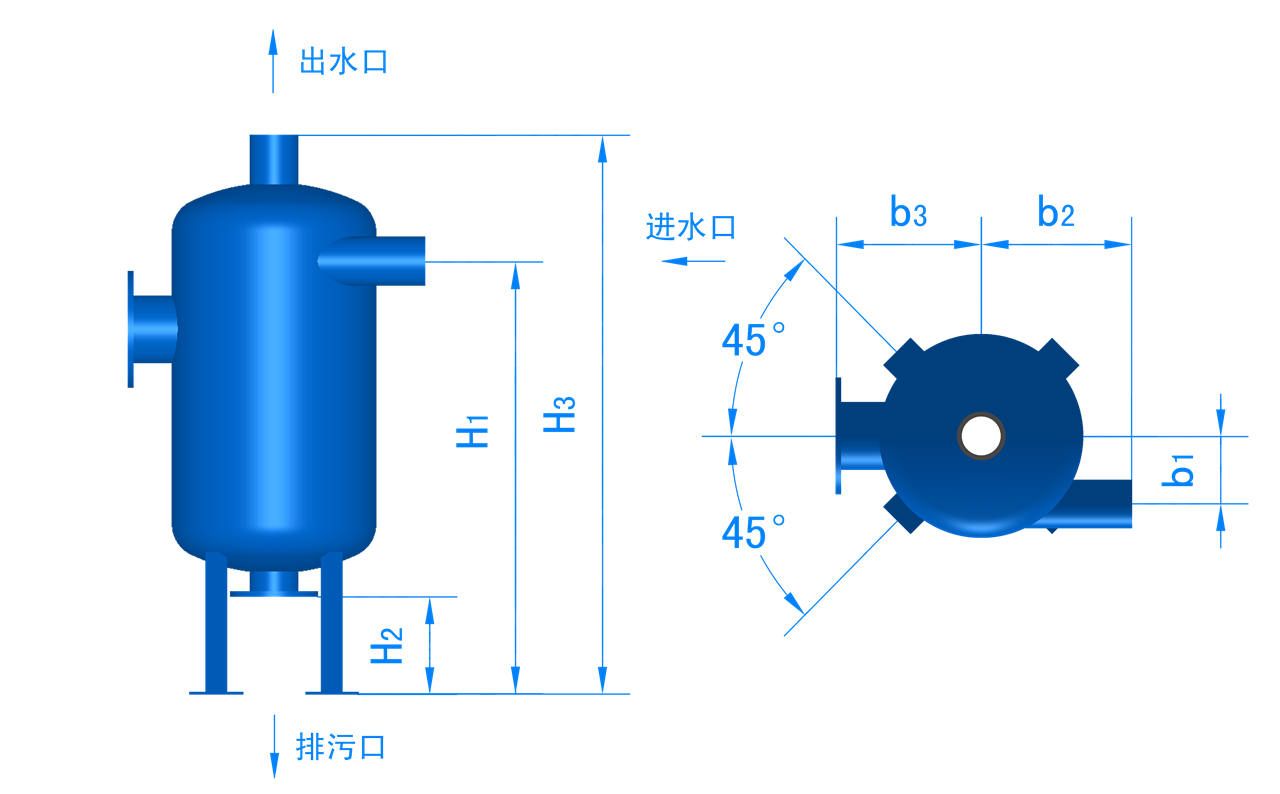 规格 | 筒径 | b1 | b2 | b3 | H1 | H2 | H3 | 四地脚圆 | 排污 |